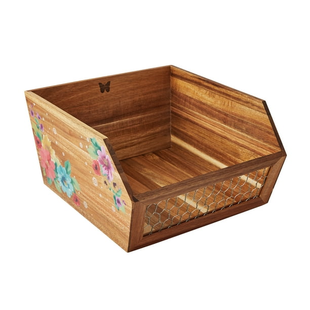 The Pioneer Woman 12 X 11 X 6 Acacia Wood Single Shelf Open Top Kitchen Storage Bin Brown Floral Walmart Com